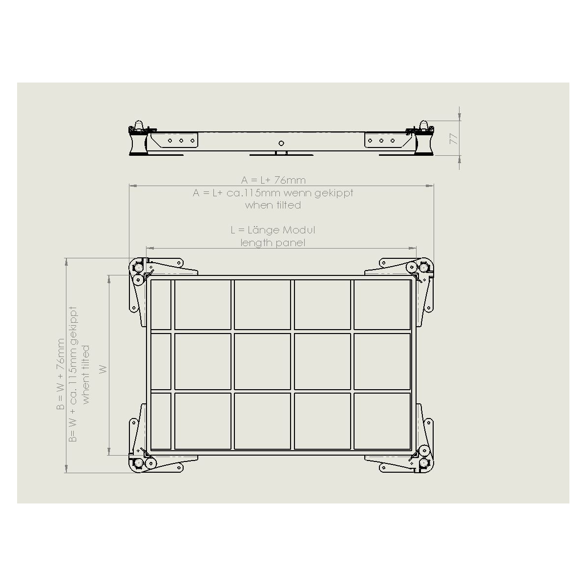 - Gesamthöhe 77mm, Gesamtbreite/-länge Modul + 76mm (beim Aufstellen braucht man pro Seite ca.60mm mehr vom Modul weg gemessen)